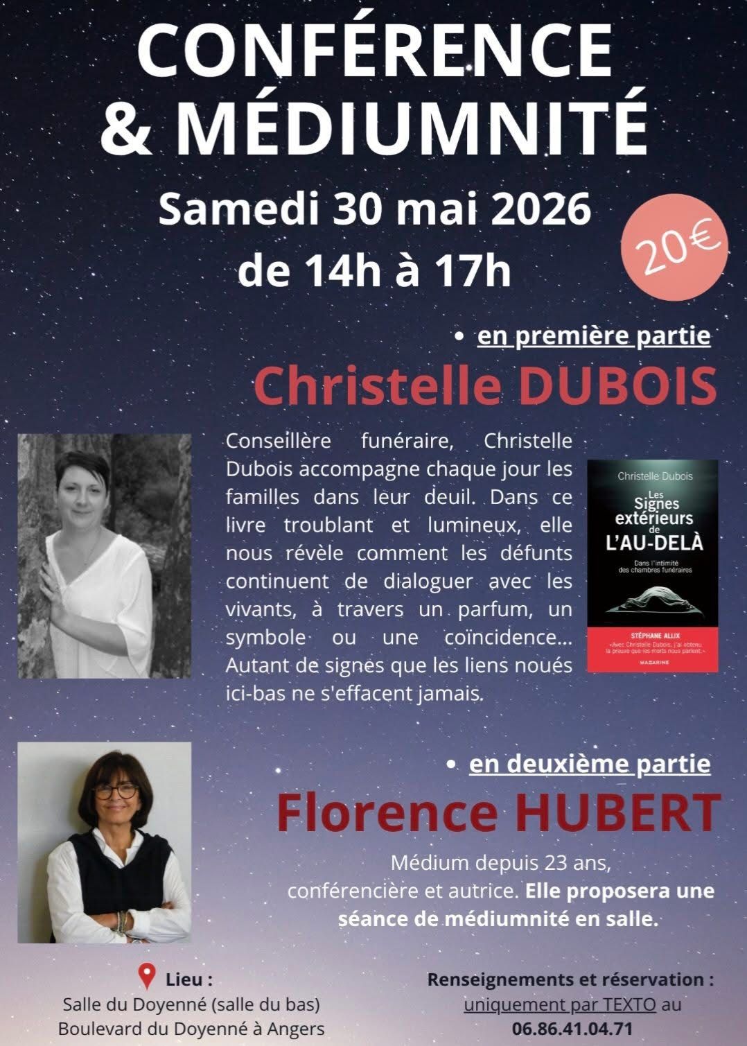 Conférence et contacts de nos défunts en salle à Angers le 30 Mai 26 ( infos à suivre)